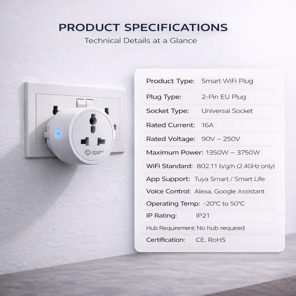 Smart WiFi 2-Pin EU Plug to Universal Socket 16A is a compact and reliable smart plug designed to provide remote control, advanced automation, power monitoring, and enhanced safety for your home and office appliances.